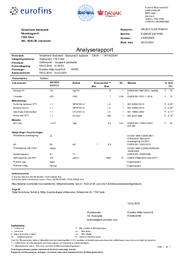 Den offentlige kvalitetskontrol planlægges og udføres efter retningslinjer fra Miljøstyrelsen og det er firmaet Eurofins der udfører kontrollerne. Der tages prøver både på vandværket og hos forbrugere, efter et fastlagt skema.